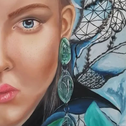 “Mavi Umut”, gençliğin gücünü ve içsel direnci simgeleyen bir portredir. Figürün yoğun bakışları, izleyiciyle duygusal bir bağ kurarken, etrafını saran mavi tonlar ve soyut yaprak formları içsel huzuru ve umudu temsil eder.